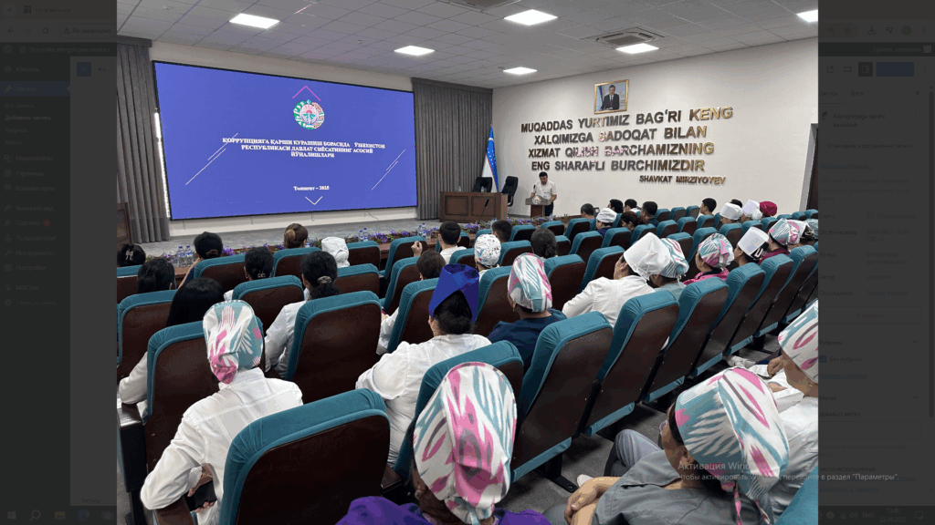 O‘zbekiston Respublikasi Prezidentining 2025-yil 21-apreldagi PQ-147-sonli qaroriga muvofiq, mehnat jamoasida korrupsiyaga nisbatan murosasiz munosabatlarni shakllantirish, manfaatlar to‘qnashuviga yo‘l qo‘ymaslik va odob-axloq qoidalariga rioya qilish bo‘yicha targ‘ibot va tashviqot ishlarini olib borish davlat organlari va tashkilotlarning ustuvor vazifalaridan biri etib belgilangan. Mazkur ustuvor vazifalar ijrosini ta’minlash, shuningdek, xodimlarda qonunga va huquqga bo‘lgan xurmat xissini yanada kuchaytirish, xuquqbuzarliklar profilaktikasining samaradorligini oshirish maqsadida, O‘zbekiston Respublikasi prezidentining 2019-yil 9-yanvardagi PF-5618-sonli farmoni bilan tasdiqlangan Jamiyatda xuquqiy madaniyatni yuksaltirish konsepsiyasi 4-bandining beshinchi kichik bandiga asosan, Sog‘liqni saqlash vazirligi tizimida 2025-yiling avgust oyi “Korrupsiyaga qarshi kurashish oyligi” deb e’lon qilingan. Oylik doirasida Respublika ixtisoslashtirilgan allergologiya va klinik immunologiya ilmiy amaliy tibbiyot markazida markaz rahbari prof. Razikova I.S. boshchiligida markazning barcha xodimlari va Olmazor tumani IIB jinoyat qidiruv tizkor bo‘limi xodimi kapitan Mamadaliyev X. B. xamda Olmazor tumani prokuror o‘rinbosari mayor Akilov S.A. ishtirokida markazning katta majlislar zalida “Korrupsiyaga qarshi kurashish borasida O‘zbekiston Respublikasi davlat siyosatining asosiy yo‘nalishlari” mavzusida uchrashuv va ochiq davra suxbati bo‘lib o‘tdi. Ushbu uchrashuvda mas’ul xodimlar sog‘liqni saqlash soxasida korrupsiyaga tegishli vaziyatlarni tanishtirdilar va xodimlarni qiziqtirgan barcha savollarga javob berdilar.