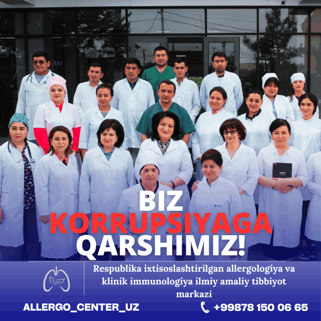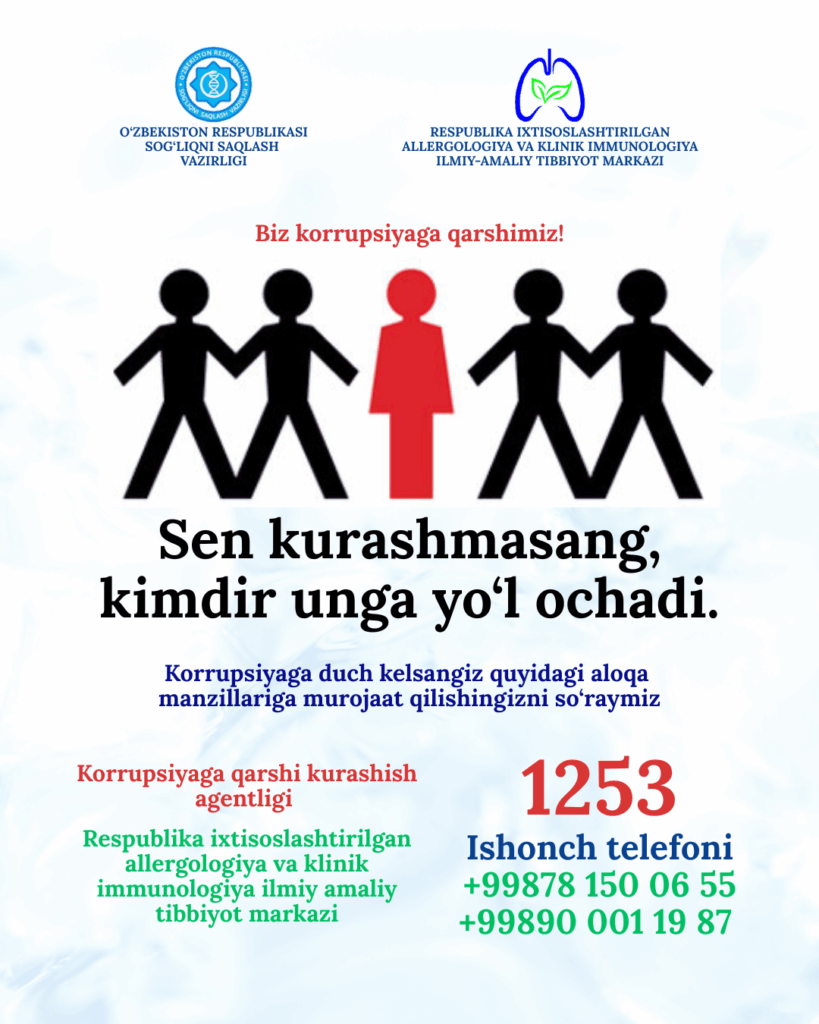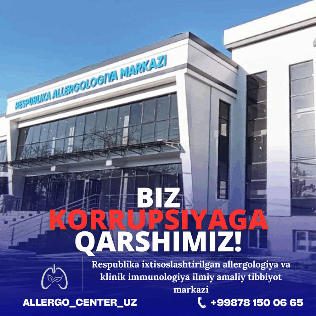 Respublika ixtisoslashtirilgan allergologiya va klinik immunologiya ilmiy amaliy tibbiyot markazi korrupsiyaga qarshi kurashish bo’yicha ishonch telefon raqami: +99878 150 06 55; +99890 001 19 87.