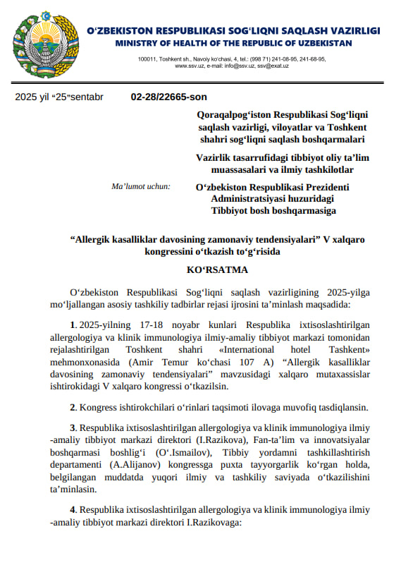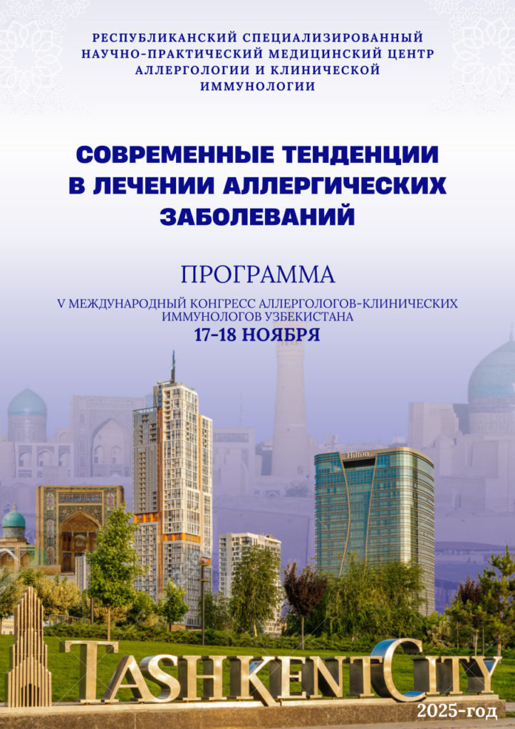 Республиканский специализированный научно-практический медицинский центр аллергологии и клинической иммунологии приглашает Вас принять участие в V международном конгрессе аллергологов-клинических иммунологов Узбекистана “Современные тенденции в лечении аллергических заболеваний”, который будет проводиться 17 ноября 2025 года в г. Ташкент, зал заседаний гостиницы AZIMUT Grand Hotel Tashkent, 18 ноября 2025 года в зале заседаний Республиканского специализированного научно-практического медицинского центра аллергологии и клинической иммунологии.